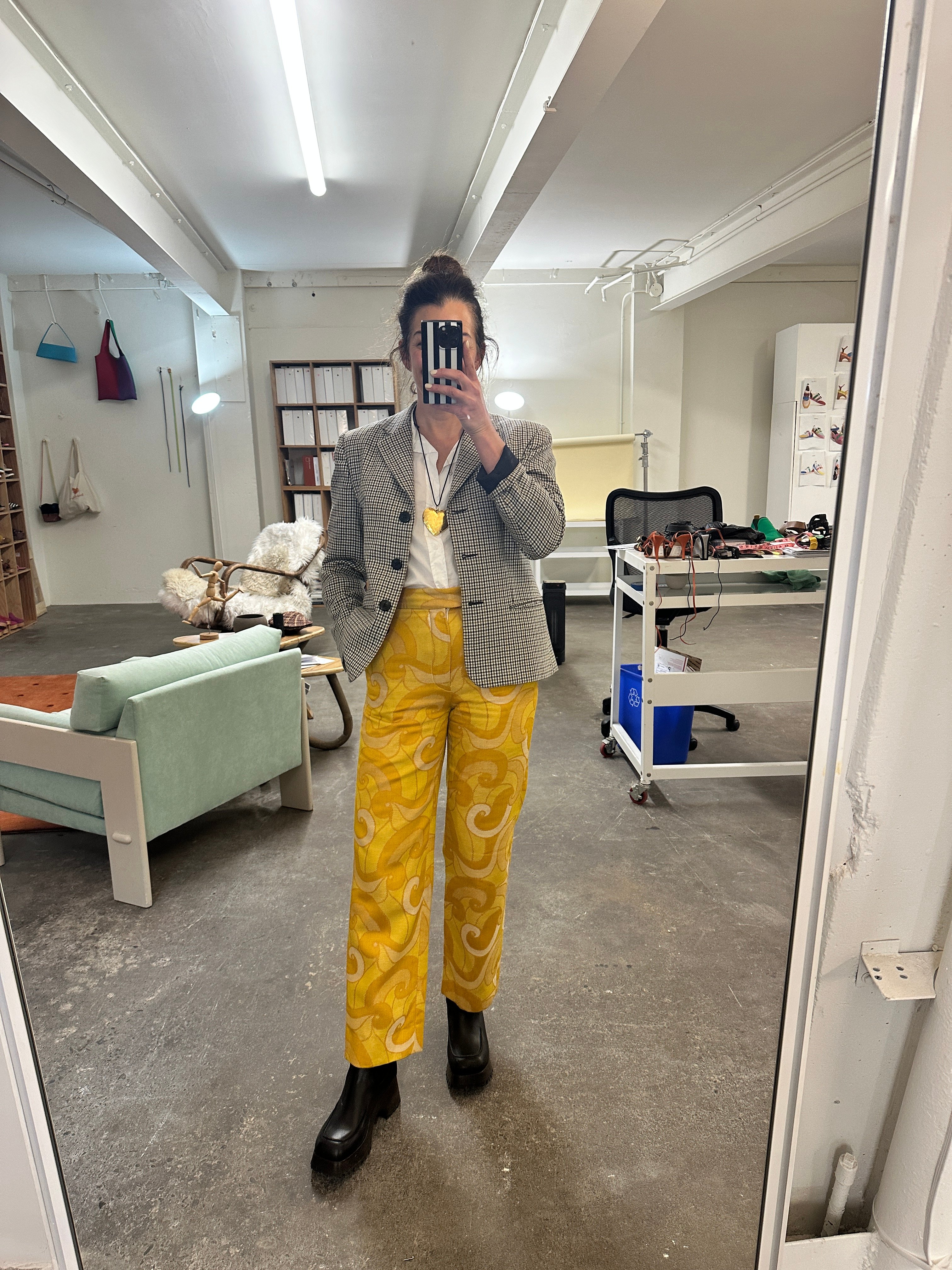 Pictured above are the pants that inspired the theme for this! These are form a brand called Bode, they’re made from vintage curtains, they’re menswear styled, but have ties on the side which add a femme touch, and I adore them. Here I’m wearing them with a button down from LMND a vintage blazer, the perfect heart necklace and our Loma clog boots.