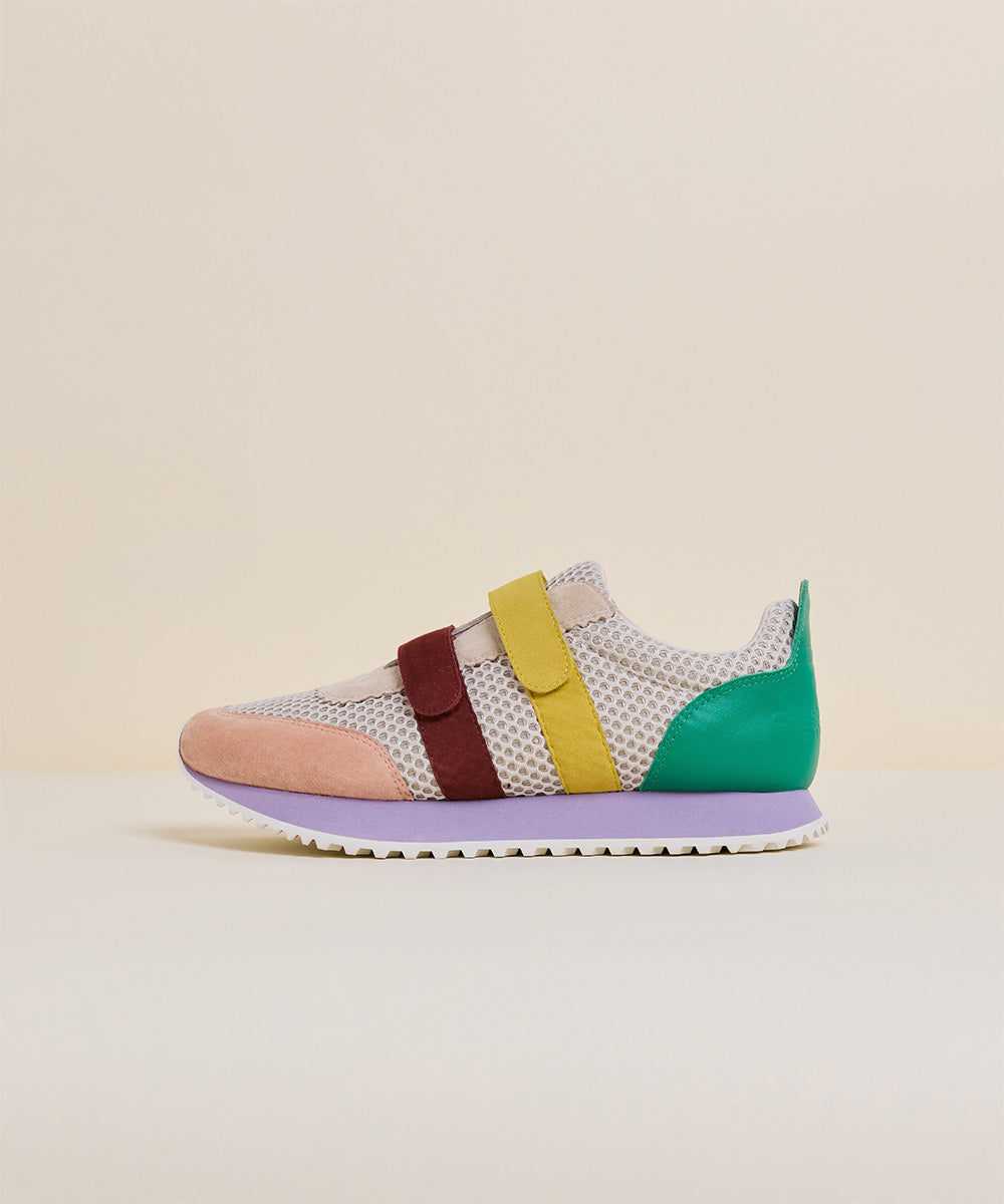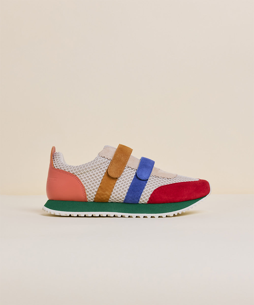 A retro-inspired velcro strap sneaker with a tapered toe box, in our signature multicolors.