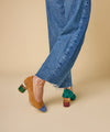 A classic pump with playful details like contrasting toe caps and dyed wood and resin block heels.